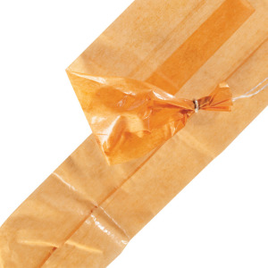 Fibrous Casings are made of plant cellulose (think tea bag). These casings are non-edible. They will hold anywhere from 1 to 6 lbs. per casing, depending on size. They are tied at one end. They can be clear or mahogany in color, and printed or unprinted. Prior to use, these casings must be soaked in water for 20 - 30 minutes to make them pliable and easy to use.